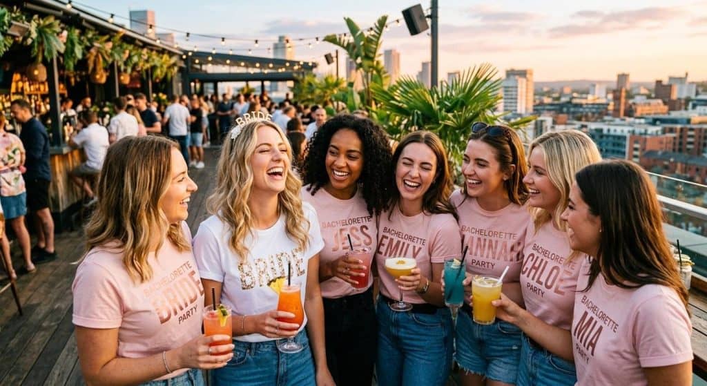 The case for matching shirts isn’t just aesthetic. At a destination bachelorette – and 65% of bachelorette parties are now overnight or destination trips, according to a 2026 guide from GreatEvent – a matching group is a practical thing. You spot each other in crowded airports, at beach bars, on hotel pool decks. It matters more than people expect until they’re actually there.